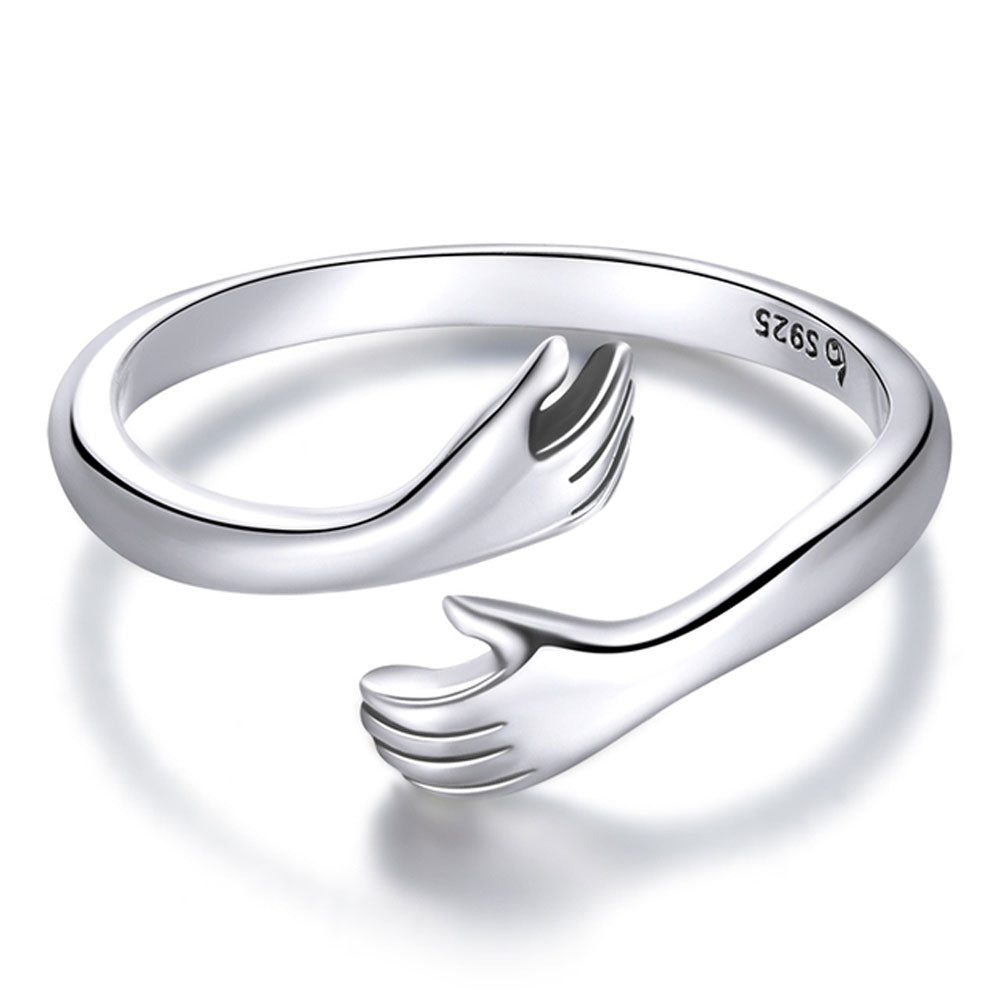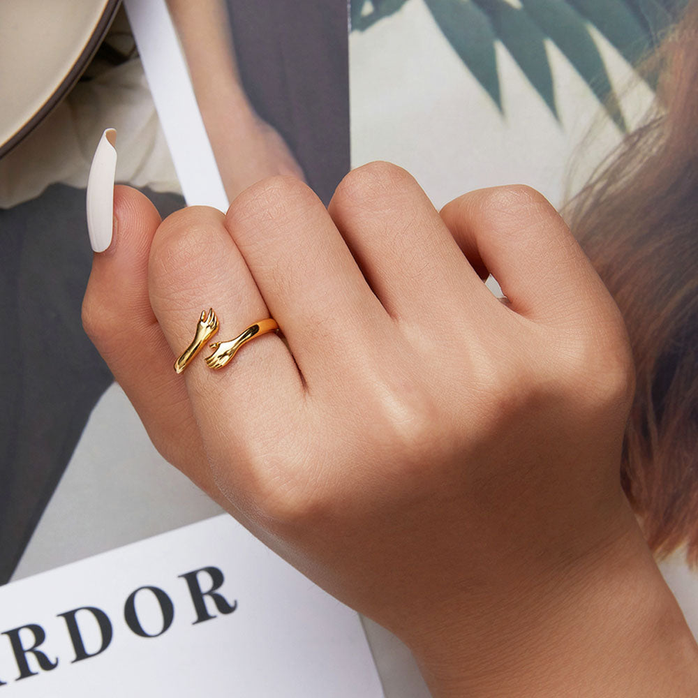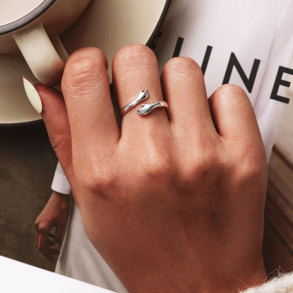 Sentite il calore di un abbraccio eterno con questo anello. Questo pezzo unico raffigura due mani che stringono delicatamente il dito nell'immagine di un abbraccio eterno. Più che un semplice anello, è un simbolo di conforto e amore da indossare ogni giorno.