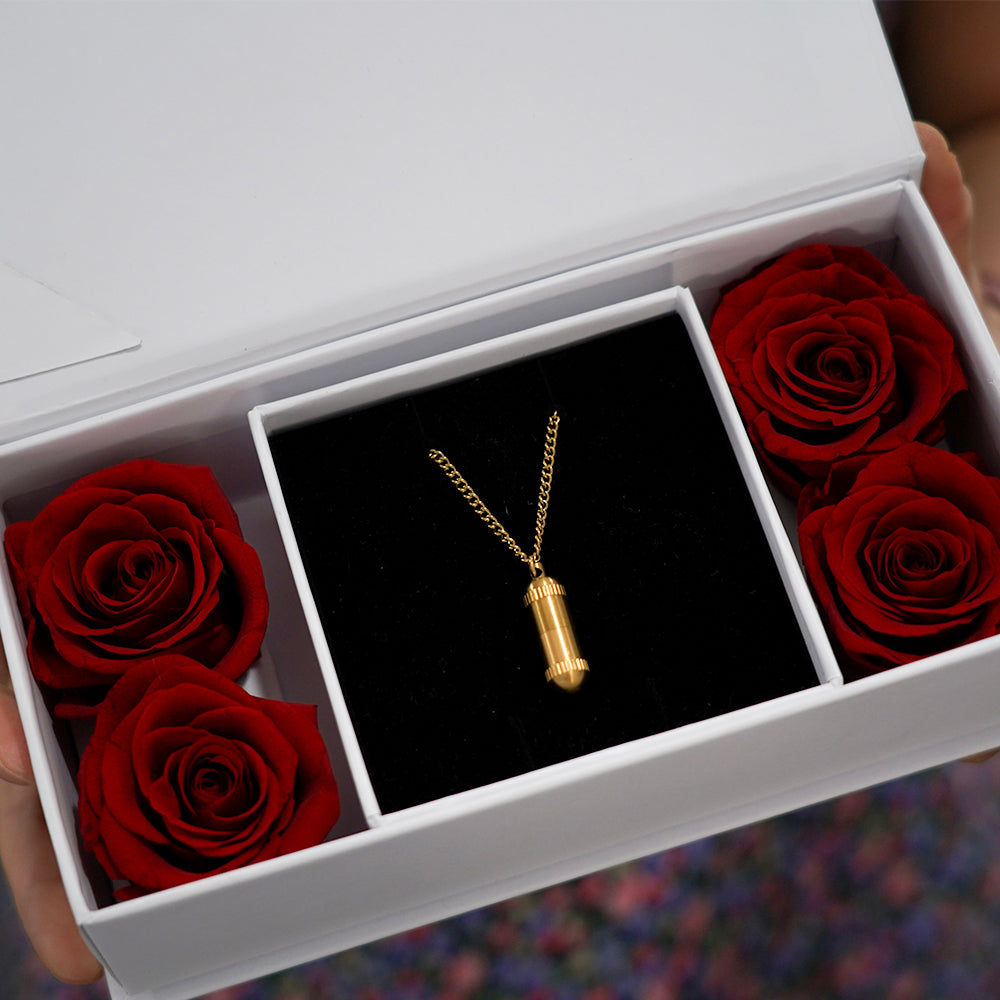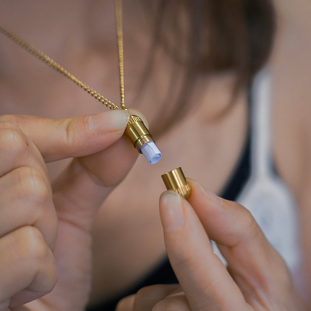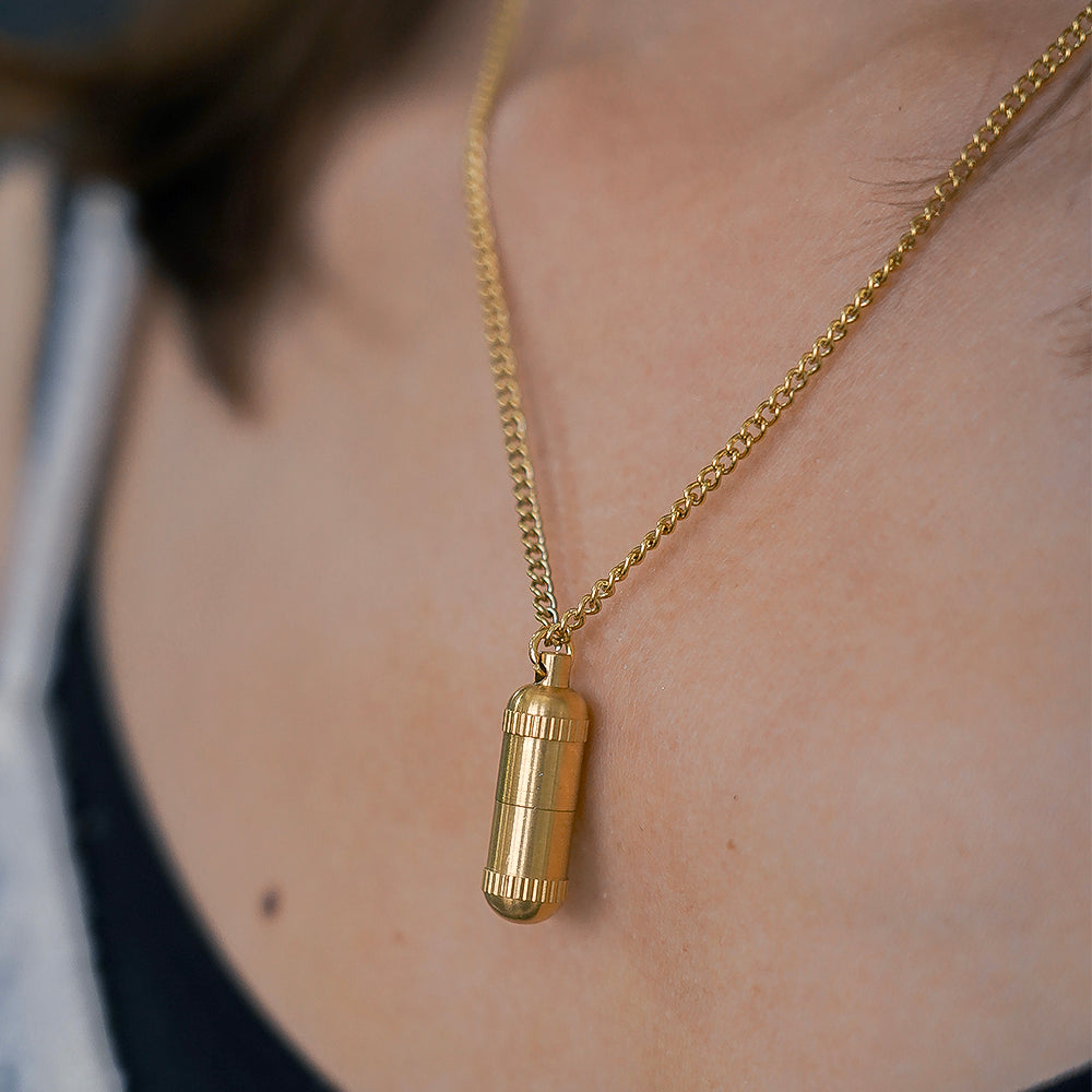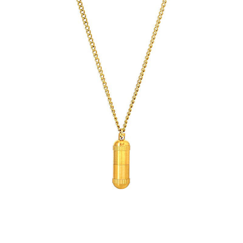 Náhrdelník s kapsulou Manifestation je ručne vyrobený z nehrdzavejúcej ocele 316L so zlatou povrchovou úpravou a je navrhnutý tak, aby vydržal celý život.